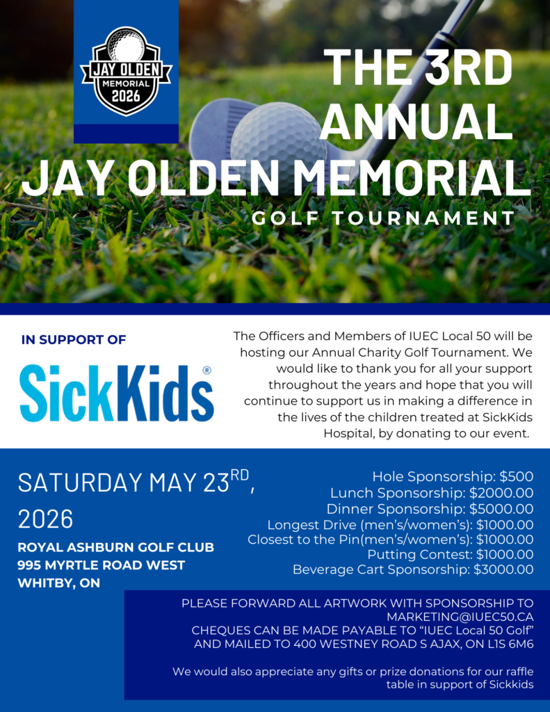 Tickets for the 3rd Annual Jay Olden Golf Tournament will be sold in person at the union hall on April 13th, 2026, starting at 7 am. First-come, first-served $150 per person. More details to follow.