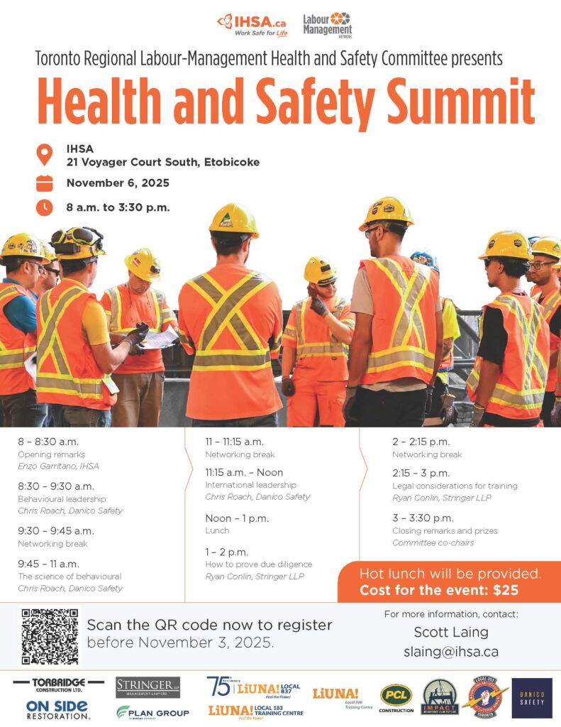 The IHSA is hosting a Health and Safety Summit on November 6th, 2025. Details are below. Scan the QR code to register or email Scott Laing for more information.